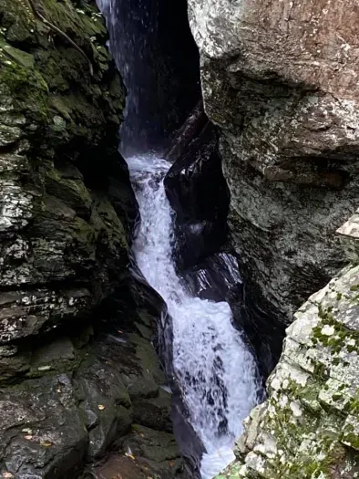 The trail follows a creek most of the way, which keeps it scenic from start to finish. The waterfall itself flows through a split in a massive rock, making it one of the more unique sights in the area.