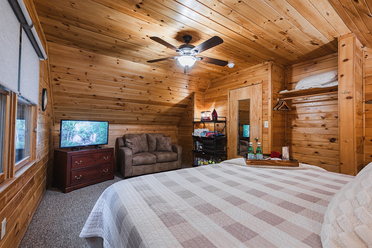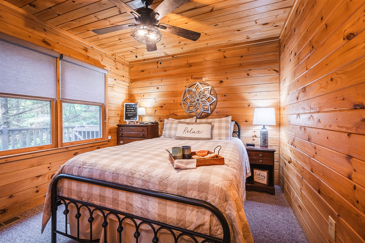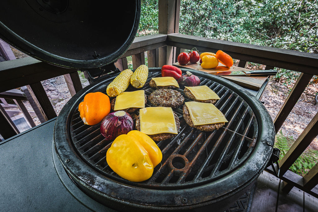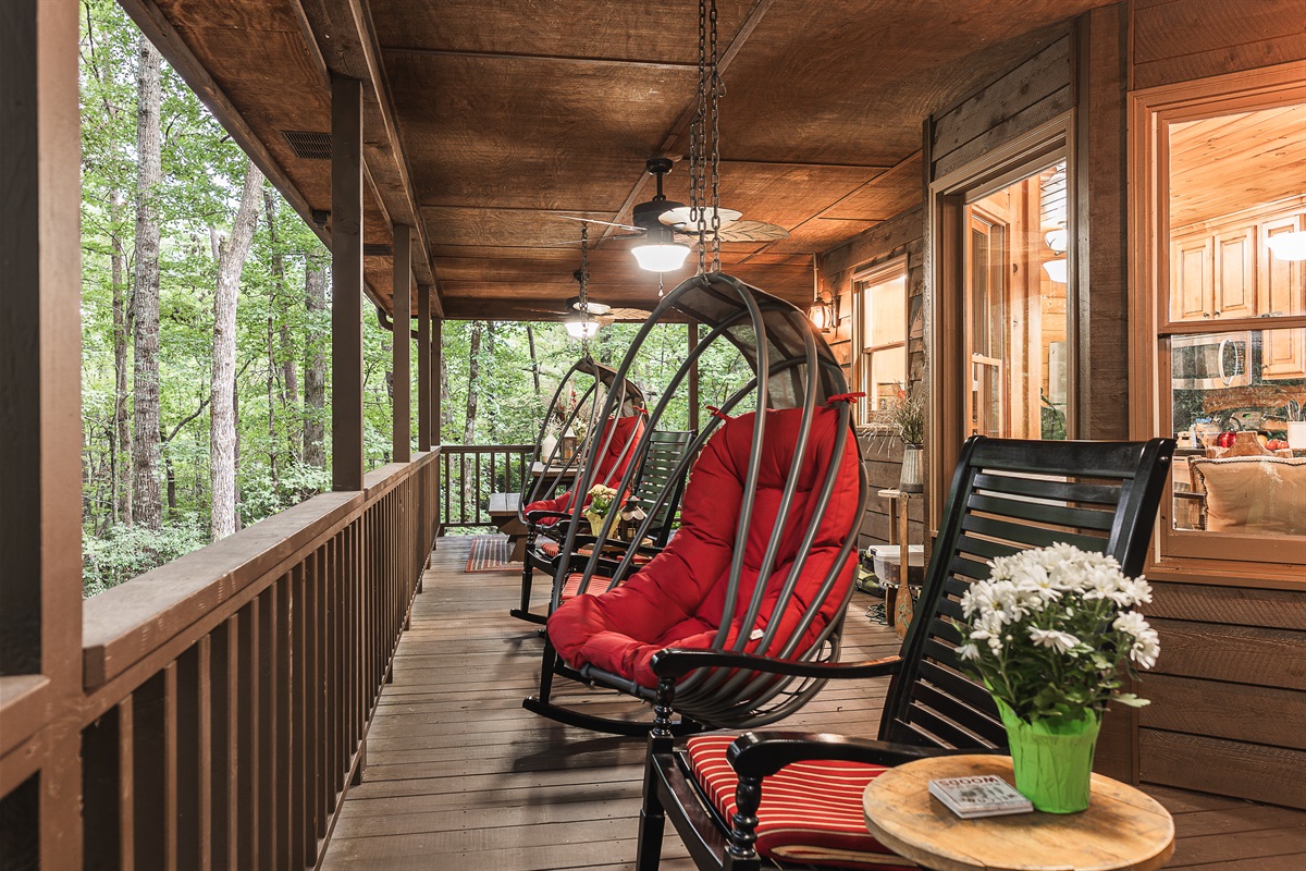 Freedom Finder is a spacious cabin with 3 bedrooms; 2 upstairs and one downstairs. With 2 fire pits, hot tub, luxurious porch swings, and an outdoor bed, the outdoor space is an oasis of tranquility. Grill some burgers on the AKORN and play a game of corn hole or horse shoes. On those colder days, curl up by the fireplace and play some board games or watch a movie. There's plenty of room to stretch out with 3 full-size sofas in the den. Freedom Finder is also dog-friendly.