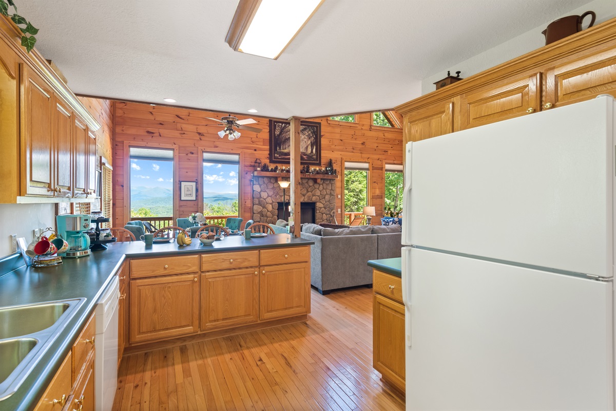 The living room features a stone fireplace, soaring ceilings, and large windows framing the mountains beyond. It’s ideal for movie nights, long conversations, or simply relaxing after a day exploring Helen and the surrounding area.